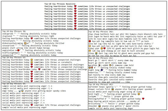 Key-phrase extraction was performed using the rapid automatic keyword extraction (RAKE) algorithm [24] to identify prominent themes in each dataset. This analysis helps determine whether regional variations influence the way emotions are discussed. Since emotions are often context-dependent, identifying key phrases allows for a deeper understanding of how different linguistic communities articulate emotional experiences. The results from this technique further inform how well synthetic datasets capture the thematic elements essential for emotion detection.