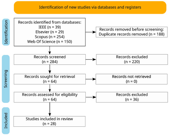 According to the bibliographic search conducted in the four databases, i.e., Scopus, Elsevier, IEEE Xplore, and Web of Science, 254, 29, 39, and 150 articles were found, respectively, totaling 472 works. Subsequently, 188 duplicates were identified and removed, leaving 284 articles for review.