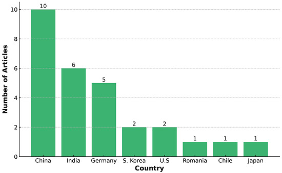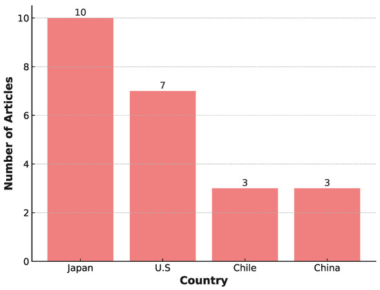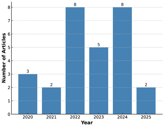 Figure 2 illustrates the number of articles published per year. It was observed that 2022 and early 2024 saw the highest publication rates, while 2020 and 2021 registered fewer publications. Two articles were published in 2025. While these data are included in the figure, it is important to note that the comparison may not be entirely fair, as the search was conducted only until March of this year.