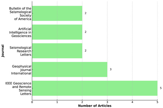 Figure 4 presents the journals in which the selected articles were published for this review. Examples include IEEE Geoscience and Remote Sensing Letters with five articles and Geophysical Journal International with three. Journals such as Artificial Intelligence in Geosciences, Seismological Research Letters, and Bulletin of the Seismological Society of America each contributed two articles. Table A1 provides a list of journals with one article in this review.
