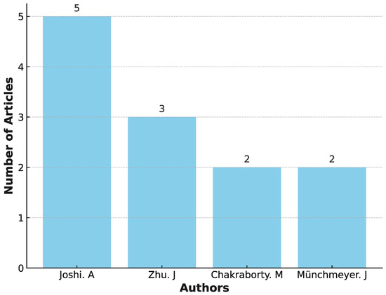 Figure 5 highlights the authors with the most publications. Joshi has five articles, followed by Zhu with three. Chakraborty and Münchmeyer each have two. Table A2 lists the authors with one article in this review.