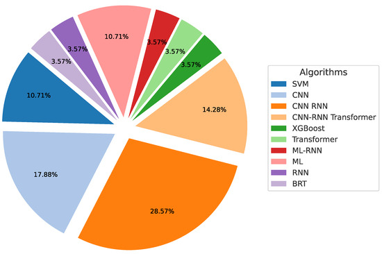 Percentage use of SVM, CNN, RNN, and other DL and ML techniques.