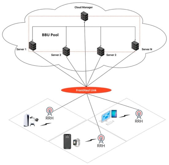 As mobile technologies have advanced from 1G to 6G, the objectives of users and network operators have changed. However, communities are becoming more data-centric, reliant on data, and automating their activities more and more in the modern world. The widespread application of automation in industrial production processes will greatly boost productivity. Millions of sensors will be deployed across homes, factories, and cities, with AI-powered systems running in local cloud and fog environments to support innovative applications [,,,,]. To accommodate a wide range of devices and address future data demands, 6G new radio (NR) networks are anticipated to meet these needs through expertly managed spectrum resources [,,]. The goal of recent research has been to determine how to improve the power efficiency of cellular networks. Numerous strategies have been proposed to reduce the energy consumption of BSs, which make up 60–80% of the total energy usage [,]. One of these strategies is switching from the conventional distributed base station (D-BS) design [] to the cloud radio access network (C-RAN), a centralized, cooperative, cloud-based, and environmentally friendly radio base station architecture that China Mobile proposed in 2010 [,]. The architecture of the cloud radio access network consists of two parts: the remote radio head (RRH) and the baseband unit (BBU). Digital processing of baseband signals is performed by the BBU in conjunction with all higher-layer operations. Using antennas, RRH transmits and receives wireless signals [,].
