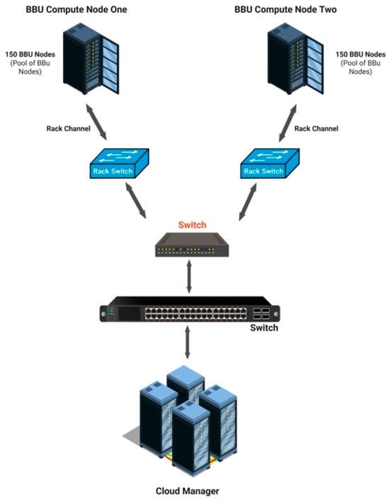 With virtual BBUs in virtual machines (VMs), cloud environments can use cloud VM migration for efficient use of resources and balancing loads. In cloud environments, balancing loads helps minimize unnecessary use of resources through workloads redistributed between overused and underused nodes. VM selection and migration allow the best migration options between overused and underused hosts. A load balancing with resource migration strategy across several BBUs in a super base station architecture was proposed by the authors in []. Their suggested architecture uses a radio network controller (RNC) to facilitate resource sharing amongst BBUs. A C-BBU’s resources are distributed across several radio units located in various geographic regions.