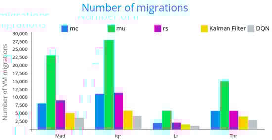 To assess the effectiveness of the proposed strategy, a comparison and analysis with existing migration and VM selection strategies are required. In this experiment, four VM selection strategies are compared against the DRL selection strategy: the Kalman filter prediction (KAL), random selection (RS), minimum utilization (MU), and maximum correlation (MC) [].