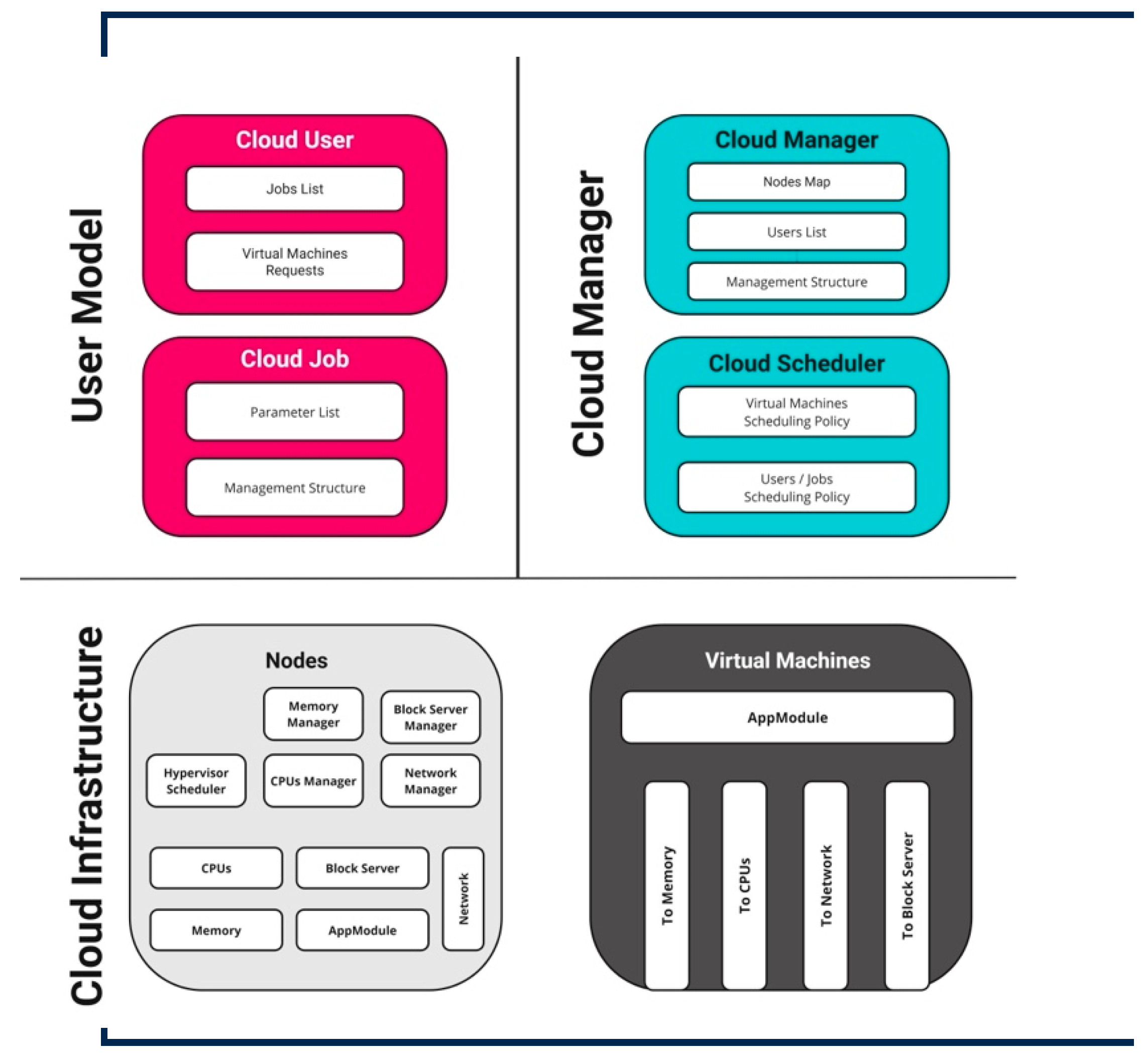 As previously illustrated in Figure 1, this paper uses the centralized architecture of BBU. To oversee the performance of all virtual resources, BBUs are grouped together as a BBU pool in a single location and managed by a cloud manager. Cooperative radio resource allocation and large-scale collaborative processing are made possible by the virtualized BBU pool. The iCanCloud framework [41], a simulation platform for modeling and simulating cloud environments, is used to simulate the system. The OMNeT++ platform has been used to develop iCanCloud. The simulation framework simulator INET is used by the network systems. The iCanCloud simulator kernel includes a range of modules designed to replicate the behavior of specific components, organized according to their functions. The iCanCloud platform’s modular architecture consists of three main sections: the user model, cloud manager, and cloud infrastructure as shown in Figure 2.