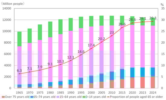 Japan is not the only country facing such social problems; many countries are plagued by age-related imbalances. The United Nations defines a society in which the proportion of people aged 65 or older exceeds 7% of the population as an “aging society”, a society in which the proportion exceeds 14% of the population as an “aged society”, and a society in which the proportion exceeds 21% as a “super-aged society” [1,4]. According to the World Bank’s demographic data for 2023, 21 countries (Japan, Italy, Germany, France, Spain, etc.) are super-aged societies, 67 are aged societies, and 122 are aging societies. The top five countries in terms of older population are China, India, the United States, Japan, and the Russian Federation. As of 2020, the world’s older population was 739 million, representing 9.4% of the world’s population. In other words, the world is already becoming an aging society on average, and it is predicted that this proportion will reach 18.7% in 35 years [5].