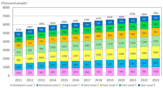 Japan is experiencing a rapid decline in birth rates and has an aging population. The United Nations defines an older person as someone aged 65 or above. As shown in Figure 1, compared to 50 years ago (1975), the older adult population has quadrupled to 36.77 million, or approximately 29.5% of the total population (124.7 million) [1]. As shown in Figure 2, the number of older people that are certified as requiring support or nursing care is 6,766,000, which is approximately 18.4% of the older adult population [2]. However, the number of people who need support or nursing care far exceeds 6,766,000, and this number is likely to continue to increase. A large amount of labor is required to care for these individuals.
