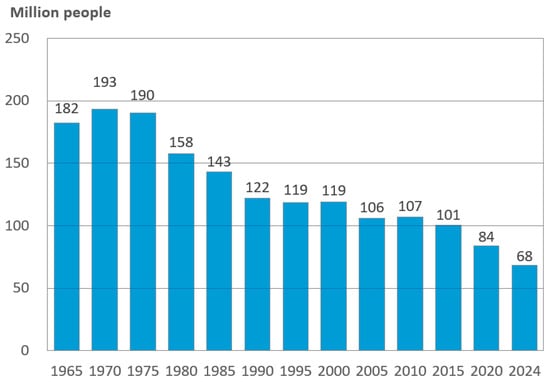 Regarding Japan’s birth rates, as shown in Figure 3, the number of births has been decreasing every year; in 2024, the figure was 684,000, down to 35% of the number 50 years ago (1.9 million in 1975) [3]. If the death rate before reaching the productive age is considered, it should be less than 684,000. If nursing care is based solely on human resources, it faces a severe shortage for both the productive population and nursing care personnel.