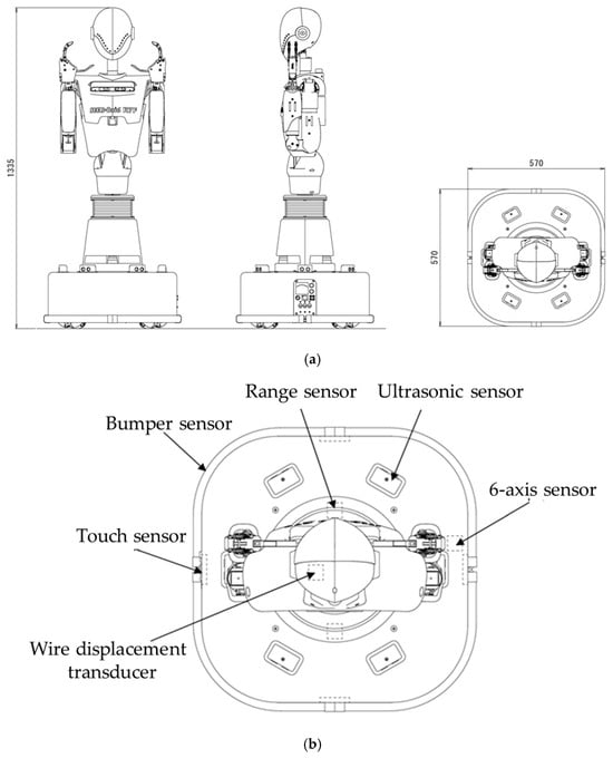 Figure 5a shows the dimensions of the robot prototype (W 570 × D 570 × H 1335 mm), and Figure 5b shows the sensor arrangement. As for the housing materials, the internal frame is mainly made of aluminum and the exterior cover is made of ABS plastic. The robot weighs approximately 90 kg. The power source is a fully sealed lead-acid battery. Two RGB-D cameras are mounted on the head and chest. Two speakers with built-in microphones are mounted around the head and ears. Three-axis force sensors are attached to both of the robot’s wrists. The wheel used is an original safety-type omniwheel with a built-in motor, wheel diameter of 200 mm, wheel motor capacity of 90 W/24 VDC (brushless), and motor gear ratio of 21:1. The wheel motors are mounted inside the hubs of the four wheels, and each wheel motor is equipped with a Hall sensor (approximately 1000 pulses/wheel revolution) and an encoder (43,008 pulses/wheel revolution). Two range sensors are mounted on the front and rear wheels, with a measuring distance of 4 m and a measuring angle of 240°. As shown in Figure 5, six-axis sensors are installed to detect three-axis acceleration and three-axis angular velocity. An ultrasonic sensor is installed every 60 degrees, with a total of six sensors installed, with a measuring distance of 2 cm to 3 cm. A bumper sensor is installed every 90 degrees, a total of four sensors are installed, and the force is 19 N. A contact sensor is installed every 90 degrees, a total of four sensors are installed, and the force is 3 N. One wire displacement transducer is installed to track the electric cylinder.