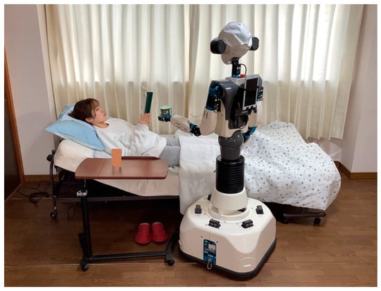 A person in need of nursing care is unable to move freely around the room by him-self/herself because they have difficulty walking, so they stay in bed all day and become bedridden. Although food and drink are available in refrigerators, bedridden people can-not go to the refrigerator to eat or drink by themselves outside the home helper’s visiting care hours. In addition, although they have bedrooms, living rooms, kitchens, toilets, and bathrooms, they cannot live like fully functional people. Thus far, we have developed an algorithm for understanding the intentions of a bedridden person and confirmed its effectiveness using a prototype of a humanoid nursing care robot [29,30].