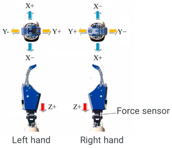 The installed force sensor is a three-axis force sensor that can measure forces in the three axial directions of x, y, and z. It can measure large forces with a measurement range of ±250 N in the x and y directions, and 0 to 500 N in the z direction. The force sensor sampling period is 100 ms. The orientation of the force sensor is shown in Figure 8.