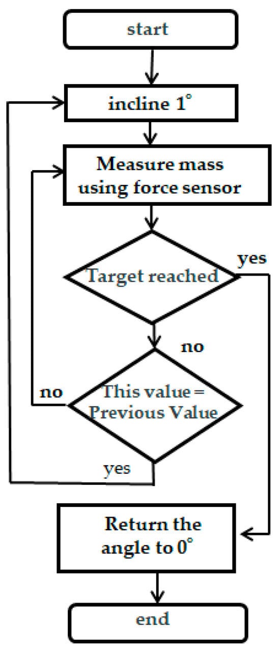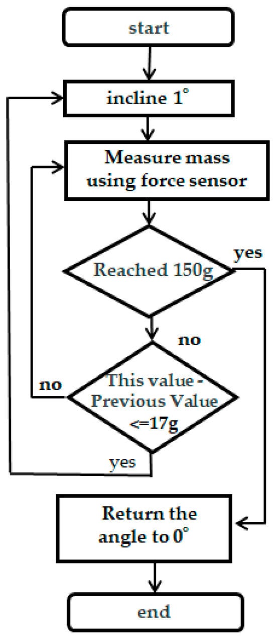 The reason for including ④ is the possibility that the liquid poured due to the 1° tilt at the point of measurement in ② may not have flowed completely. Therefore, with a sampling period of the force sensor of 100 ms, the measured value of the current mass is compared with that of the previous mass. If they are different, it is judged that the amount of liquid poured by tilting at an angle of 1° has not flowed completely, and the angle of the hand holding the pitcher is not changed, i.e., wait until the pitcher is poured out at the same angle and return to ②. If the measured mass of the pitcher this time is the same as the previously measured mass, it can be judged that the pitcher has been poured out at the same angle, and the process returns to ①. The hand holding the pitcher is tilted by another 1°.