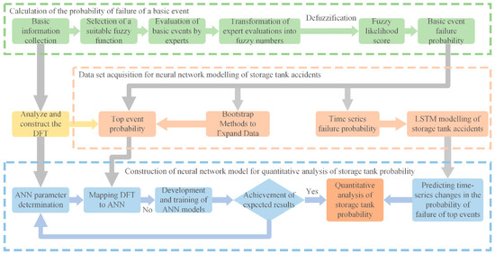 In this study, Section 2 systematically introduces the method for constructing a quantitative probability calculation model based on Fuzzy DFT and neural networks, including the construction of the DFT, fuzzy calculation of failure probabilities for storage tank accident factors, data acquisition preprocessing, and the development of a hazardous chemical storage tank leakage accident model based on neural networks. Section 3 conducts a case analysis using a storage tank leakage accident as an example, covering the introduction of the accident case, specific application of the proposed method, including the construction of the dynamic fault tree for the tank leakage accident, determination of fuzzy failure probabilities for basic events, risk data augmentation, hyperparameter tuning, and data processing and parameter setting for the ANN and LSTM models. Section 4 presents a discussion of the results, which not only verifies the proposed quantitative probability calculation method based on Fuzzy DFT and neural networks for storage tanks but also provides an in-depth analysis of the impact of different parameters on the performance of the ANN model, model performance evaluation based on data updates, independence of basic events, input variable sensitivity, and the temporal development of the failure probability of hazardous chemical storage tank leakage accidents. Section 5 summarizes the research conclusions and synthesizes the overall work.