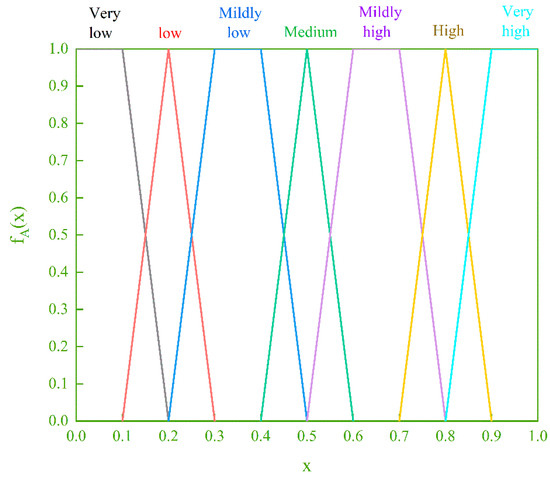 where . A triangular fuzzy number is denoted as A = (a, b, c). The parameter ‘b’ represents the maximum value of fA(x), that is, fA(b) = 1, which is the most likely value of the evaluation data. ‘a’ and ‘c’ are the lower and upper limits of the available evaluation range.