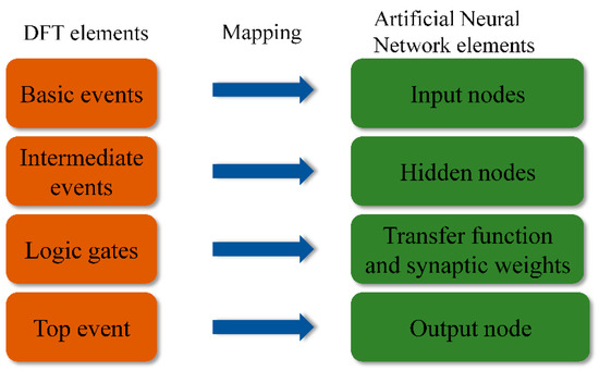 The ANN-based model for quantitatively calculating the probability of hazardous chemical storage tank accidents was conducted by mapping a Fuzzy DFT to an ANN. The mapping rule from Fuzzy DFT to ANN is shown in Figure 3, which demonstrates how the BEs and logic gates of the DFT are transformed into the input, hidden, and output layers of the ANN.
