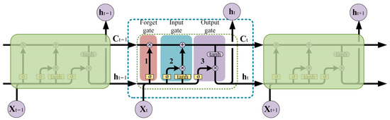 In order to deeply explore the changing law of storage tank accident probability over time, the LSTM model is used for time-series prediction to capture and analyze the dynamic change in the time dimension of accident probability [42,43]. The LSTM model can alleviate problems such as gradient explosion, which is common in traditional recurrent neural networks (RNNs) in time-series prediction tasks [44]. Special gating devices (input gates, output gates, and forgetting gates) are added to the LSTM model to deal with the large time span in time-series prediction. The model consists of multiple units; each unit only stores the information at the current time, as shown in Figure 4. The three gating devices in the unit control the flow of the information passed between the units, which gives the LSTM model excellent memory capability in dealing with sequential data, and the model is trained using the Adam algorithm.