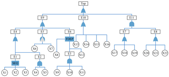 The names and descriptions of their corresponding events are illustrated in Table 2, where X1–X22 are the basic events, E1–E9 are the intermediate events, and Top is the top event. The specific events that each of them represents are listed in the following table.