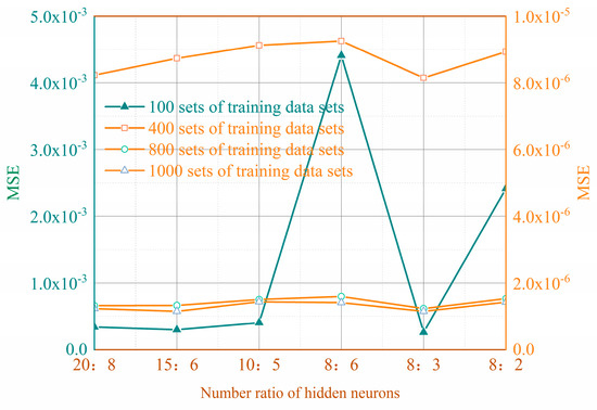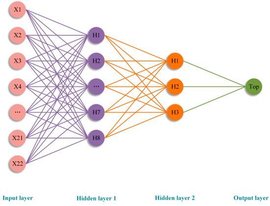 The number of input nodes in the ANN model is chosen based on the number of basic events in the DFT, while the number of hidden layers and the number of nodes in each hidden layer are determined according to the hierarchical structure and the number of intermediate nodes in the DFT. Meanwhile, in order to prevent overfitting and underfitting problems from occurring in network training, this paper proposes a rule for selecting the hidden layers by combining the methods proposed by Panchal and Panchal [41] and combining the characteristics of the DFT in this paper, which is demonstrated in Appendix A, verifying the validity of the rule in Section 4.2.