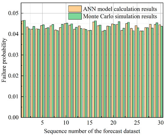 In this section, the effect of independence between basic events on the quantitative analysis of storage tank probability is analyzed, and the prediction results of the constructed ANN model are compared with the TE failure probability derived from the traditional DFT calculation method. The comparison results show that the average error of the failure probability of the top event predicted by the ANN model is 2.14%. Compared with the 3.44% of the traditional DFT method, the performance of the ANN model is improved by 38%. This performance enhancement may be attributed to the unknown dependencies between BEs in DFT, which are often ignored in traditional methods. The advantage of the ANN model is its ability to capture and account for these interdependencies between input variables, thus outperforming the traditional fault tree computation methods in terms of prediction accuracy. Furthermore, this property of ANN models is particularly important when performing probabilistic calculations for complex systems. Since real-world systems often involve multiple interdependent variables, ANN models can model these complex interactions more accurately, providing a more accurate tool for probabilistic failure calculations.
