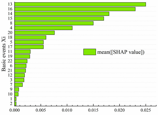 In addition, the study performed SHAP analysis on the model’s inputs to further demonstrate its interpretability. The results are shown in Figure 11, where the X-axis represents the average SHAP values corresponding to each basic event, and the Y-axis lists the different basic event numbers. This bar chart illustrates the contribution of each basic event to the model’s prediction results. From the chart, it can be observed that basic events 13, 16, 14, and 15 have relatively high SHAP values, indicating that these basic events significantly influence the model’s predictions. These basic events may play a crucial role in the occurrence of accidents, and therefore, higher weights were assigned to these features during the model training process. This is consistent with the results of the sensitivity analysis, which shows that these features have a considerable impact on the model’s output, further validating their importance in the prediction process. Based on the results of the SHAP analysis, it is now clearer how the model makes predictions, especially how it relies on these key features. This interpretability enhances our trust in the model’s behavior and provides valuable insights for future optimization and adjustments. For example, features with greater contributions could be further optimized in terms of data preprocessing and feature selection, which would improve the model’s prediction accuracy.