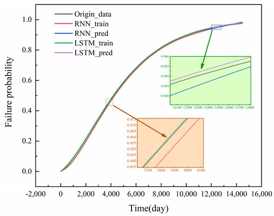 In order to effectively assess the dynamic evolution of the failure probability of hazardous chemical storage tank leakage accidents, an LSTM network model of storage tank DFT is constructed to further model and predict the DFT. When constructing the LSTM model, in the face of the incompleteness of historical data, the equipment degradation model is introduced to estimate the time-series variation of the failure probability of the BEs, and the failure probability of the TE is calculated by the corresponding calculation method of the DFT. To construct the LSTM model dataset, a total of 14,400 datasets are computed and counted, of which 80% is used to construct the training set, and the remaining 20% is used for the test set. In order to verify the applicability and superiority of the proposed model, the corresponding DFT time-series solution model is developed based on the traditional recurrent neural network (RNN) method. The time-series failure probabilities obtained from the Hidden Markov Chain are processed according to the data preprocessing method proposed earlier. The processed time-series dataset is then input into the previously constructed LSTM and RNN models to observe the differences between the output values of the two models and the true values. As shown in Figure 12, it can be seen that the LSTM model has a better performance in capturing the time-series variation.