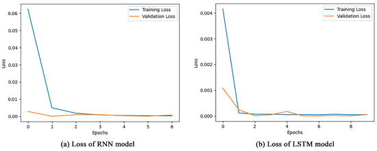 The model training results show that the traditional RNN model has a training loss of 2.1473 × 10−4, whereas the training loss of the constructed LSTM model for storage tank accidents is only 5.0337 × 10−5, as shown in Figure 13. This significant improvement confirms the superiority of the LSTM model in dealing with DFT time-series prediction. The lower training loss achieved by the LSTM model is attributed to its unique gating mechanism, which allows the model to capture the long-term dependencies in the time series more efficiently while avoiding the gradient vanishing or explosion problems that are commonly found in the traditional RNN models. In addition, the LSTM model for storage tank accidents not only performs well during the training process but also shows great accuracy and reliability in predicting the future trend of risk probability evolution and is able to more accurately predict the change in the probability of failure of storage tank leakage accidents. Considering the model training loss, prediction accuracy, and model complexity together, this LSTM model proves its potential as an effective probabilistic analysis tool. It provides a new analytical approach to hazardous chemical storage tank safety management and can play an important role in risk assessment and preventive measure development.
