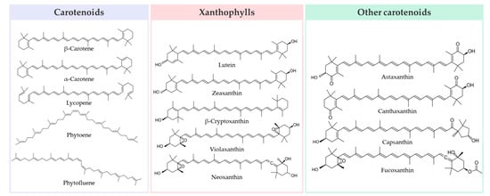 Understanding carotenoid composition in plant foods is particularly important due to their health benefits and role in dietary interventions for chronic diseases, including cardiovascular conditions and certain cancers []. Although advancements in analytical methods have improved carotenoid quantification, their structural diversity, susceptibility to degradation, and interactions with other compounds within food matrices present persistent challenges. For instance, carotenoids exhibit various molecular structures, including differences in chain length, functional groups, and conjugated double bonds, all of which influence their physical, chemical, and biological properties. Figure 1 illustrates the molecular structures of major carotenoids, highlighting their structural variability and the functional groups that contribute to their unique properties. Understanding these structures is essential for addressing analytical challenges and optimizing quantification methods.