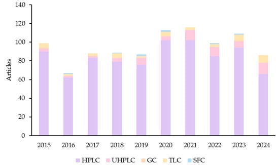 The analysis of carotenoids in food matrices relies on various chromatographic techniques, each offering unique separation, identification, and quantification advantages. Figure 2 presents the number of methods published for each of these techniques since 2015.