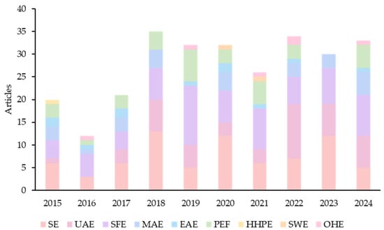 Trends in carotenoid extraction methods: number of published studies (2015–Present). SE, solvent extraction; UAE, ultrasound-assisted extraction; SFE, supercritical fluid extraction; MAE, microwave-assisted extraction; EAE, enzymatic-assisted extraction; PEF, pulsed electric field; HHPE, high-hydrostatic-pressure extraction; SWE, subcritical water extraction; OHE, ohmic heating extraction. The keyword “carotenoid” and each technique name and acronym were used for the Web of Science (WOS) database search.
