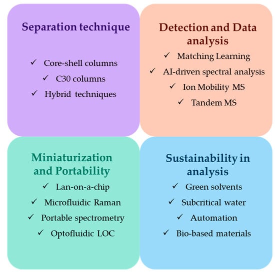 The advancements in carotenoid analysis discussed in this review have significant applications in food quality assessment, nutritional research, and functional ingredient development. Integrating green chromatography, miniaturized detection systems, and artificial intelligence can revolutionize analytical workflows, reducing environmental impact and enhancing real-time food monitoring. These innovations hold promise for industries focused on food fortification, dietary supplements, and plant-based functional foods, ensuring improved bioavailability and regulatory compliance.