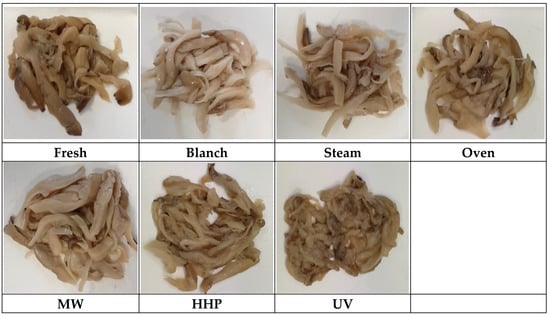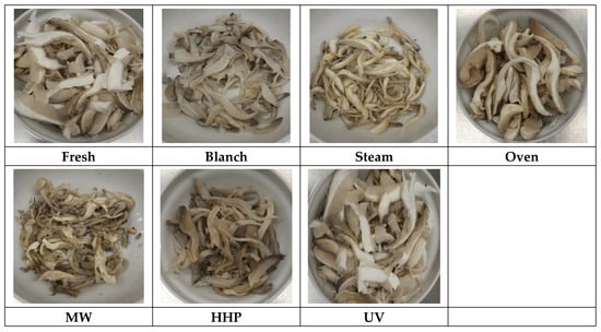 Images of the pretreated oyster mushrooms (50 g) (Fresh—fresh; Blanch—blanched; Steam—steamed; Oven—oven pretreated; MW—microwave pretreated; HHP—HHP pretreated; UV—UV light pretreated).