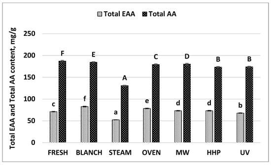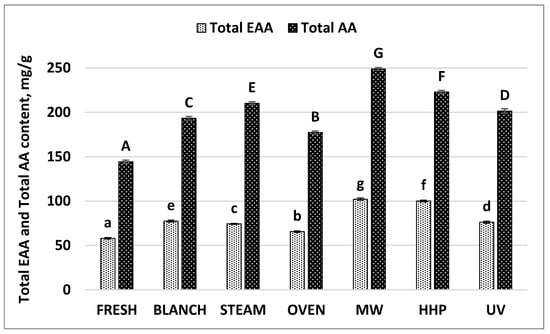 Total essential amino acid (EAA, grey column) and total proteinogenic amino acid (AA, black column) content of the oyster mushroom samples after pretreatments (mean ± SE, n = 4). Values with different letters (a–g) differ significantly among total EAA values. Mean values with different capital letters (A–G) differ significantly among total AA values (p < 0.05).