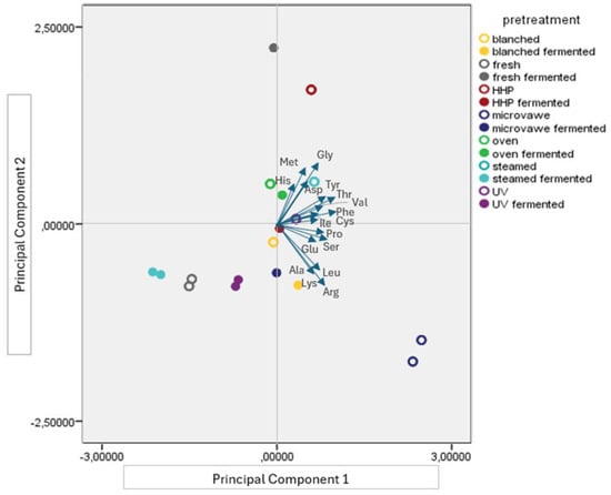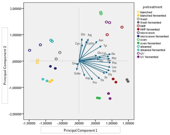 In Figure 9, the upper-right quadrant contains markers corresponding to four samples: oven-, UV-light-, and HHP-pretreated mushrooms, while the lower-right quadrant features markers for these samples’ fermented counterparts and the fresh fermented samples. The upper-left quadrant contains four samples: microwaved, steamed, fresh, and blanched mushrooms, while the lower-left quadrant contains their fermented counterparts. The clear separation of pretreated and fermented samples in principal component 2 highlights the significant impact of fermentation on the free amino acid profiles of the samples. Additionally, principal component 1 distinctly differentiates the various pretreatments. Samples located in the same quadrant (oven/UV/HHP and microwave/blanched/steamed) indicate similarities in their amino acid profiles, with the degree of similarity being reflected by their proximity to one another, forming distinct clusters. The greater distance between fermented samples and their pretreated counterparts in the oven-, UV-light-, and HHP-pretreated groups suggests that these samples underwent more substantial changes in their free amino acid composition compared to the other samples. Notably, the fresh mushroom samples exhibited the most significant change in composition, shifting from the upper-left quadrant to the lower-left quadrant upon fermentation, indicating that the application of fermentation without any pretreatments causes a pronounced alteration in the free amino acid profile. The arrows represent the free amino acids’ contribution to the principal components. The fresh, HHP-pretreated, and UV-light-pretreated fermented samples are positioned further along the positive PC1 axis, suggesting high levels of free amino acids such as glycine, valine, leucine, and isoleucine. The glutamine, arginine, and cysteine arrows point upward, indicating that these amino acids are the most influential in principal component 2, affecting the oven-pretreated samples. Although present in relatively low amounts, ornithine was most abundant in the microwave-pretreated samples, which was reflected in their position on the plot.