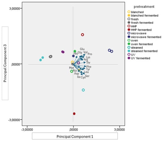 In Figure 5, the upper-right quadrant contains markers corresponding to four samples: the HHP-pretreated, steamed, UV-light-pretreated, and oven-treated fermented mushrooms. Among the samples, the fresh fermented, HHP-pretreated, microwave-pretreated, and steamed fermented samples were the furthest from their starting point, indicating that their amino acid profile differs significantly from the others. Most of the fermented samples are farther from their starting point compared to their pretreated counterparts, demonstrating that fermentation generally increases variability in amino acid profiles. Glycine is present in relatively higher concentrations in the fresh fermented, HHP-pretreated, steamed, UV-pretreated, and oven-treated fermented mushrooms, whereas arginine is more concentrated in the microwaved and blanched fermented mushrooms. On the other hand, principal component 3 accounts for additional variability not captured by the first two components, revealing further differences among the samples (Figure 6). For instance, in the first plot (PC1 vs. PC2), the HHP-pretreated fermented sample remains closer to its starting point, indicating minimal separation along these components, while in the second plot (PC1 vs. PC3), it is strongly separated along PC3, highlighting distinct amino acid changes due to high hydrostatic pressure and fermentation interaction. Proline and serine are significant contributors to the variations captured by this plot. The multivariate analysis confirmed that the pretreatments, fermentation, and their interaction had significant effects on the amino acid profile of the mushroom samples (p < 0.05).