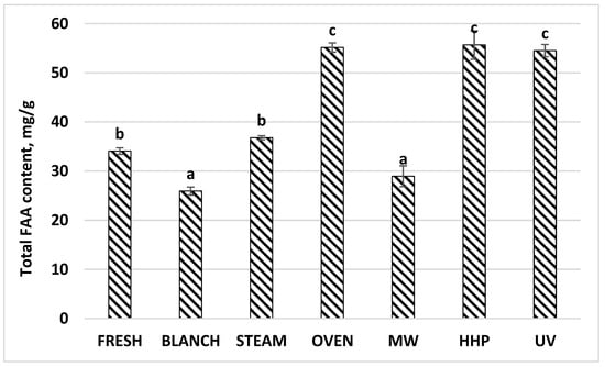 Total free amino acid content of the pretreated oyster mushroom samples (mean ± SE, n = 4). Values with different letters (a–c) show significant differences (p < 0.05).