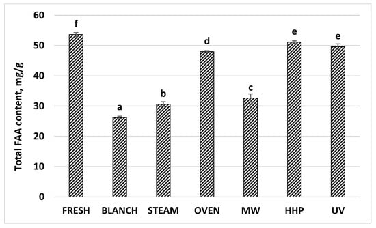 Total free amino acid content of the pretreated and fermented oyster mushroom samples (mean ± SE, n = 4). Values with different letters (a–f) show significant differences (p < 0.05).