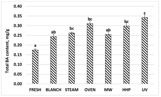 Total biogenic amine content of the oyster mushroom samples after pretreatments (mean ± SE, n = 4). Values with different letters (a–c) differ significantly among total BA values after pretreatments (p < 0.05).