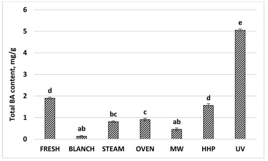 The total biogenic amine contents formed from the free amino acids of the pretreated mushroom samples are presented in Figure 10. The oyster mushroom samples contained seven biogenic amines. In the pretreated sample group, the total biogenic amine content ranged from 0.17 to 0.34 mg/g, with an average of 0.27 mg/g. The limit for the total biogenic amine content is 0.75–0.9 mg/g food (EU Commission 2017, EFSA, 2011 [15,16]). The lowest biogenic amine content was observed in the fresh samples (0.17 mg/g), while the highest was in the UV-light-pretreated (0.34 mg/g) samples. Compared to the fresh samples, all the pretreated samples showed increased biogenic amine levels: the UV-light-pretreated samples by 95.7%, the oven-pretreated samples by 77.7%, the HHP-pretreated samples by 70.6%, the steamed samples by 50.2%, the microwave-pretreated samples by 45.6%, and the blanched samples by 39.6%. However, the increase was not significant for the blanched and microwaved samples (p > 0.05).
