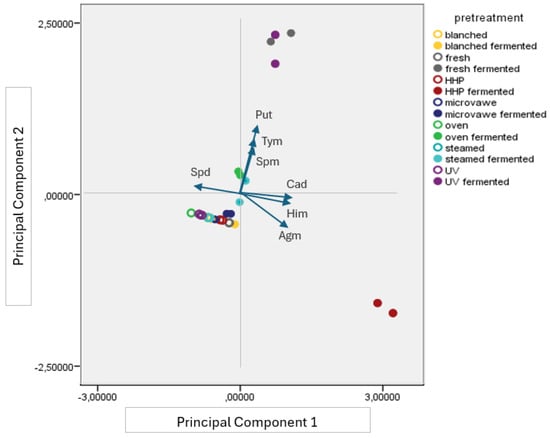 In Figure 12, the upper-right quadrant contains markers corresponding to the fresh fermented and UV-light-treated fermented mushrooms, forming a distinct cluster differing from the other sample groups, indicating similarities in their biogenic amine profiles. The lower-right quadrant features markers only for the HHP-pretreated fermented samples, located far from all the other sample groups, suggesting a unique biogenic amine composition. The markers for the oven-treated fermented and steamed fermented samples are located near the center of the plot, indicating that their biogenic amine profiles closely resemble the overall dataset average. The lower-left quadrant includes all of the pretreated samples along with the blanched fermented and microwave-treated fermented samples. This distinct clustering of pretreated samples highlights the minimal impact of pretreatments on their biogenic amine profiles, which are predominantly characterized by spermidine and show an absence of other biogenic amines. Notably, the blanched fermented and microwave-treated fermented samples exhibit similar profiles, suggesting that fermentation had a limited effect on altering their biogenic amine composition, in contrast to the fresh fermented, UV-light-treated fermented, and HHP-treated fermented samples, which showed more pronounced changes. The arrows represent the biogenic amines’ contribution to the principal components. The fresh fermented and UV-light-treated fermented samples are positioned further along the positive PC 2 axis, indicating elevated levels of biogenic amines such as putrescine, spermine, and notably tyramine in the UV-light-treated fermented samples. In addition to agmatine being exclusively detected in the HHP-pretreated fermented samples, histamine was also most abundant in these samples, a factor that influenced their distinct positioning on the plot.
