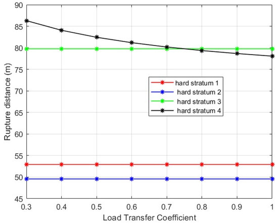 Evidently, the rupture distance of hard rock layers is of great significance in determining the critical layer position. To more intuitively demonstrate the influence of key rock-layer parameters on the rupture distance of a hard stratum, we studied the effects of the fracture angle and overburden stress on the rupture distance under the condition of determining the overburden structure. The overburden stress is characterized by the load transfer coefficient, and the larger the load transfer coefficient, the greater the load at the top interface of the bedrock. The relevant curves are illustrated in Figure 2 and Figure 3.