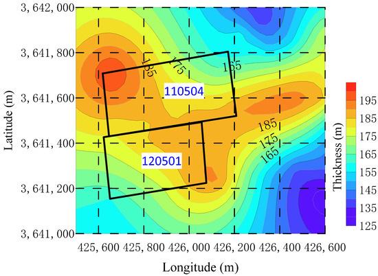 The location of the 110504 working face and 120501 working face (the base map is a contour map of bedrock thickness).