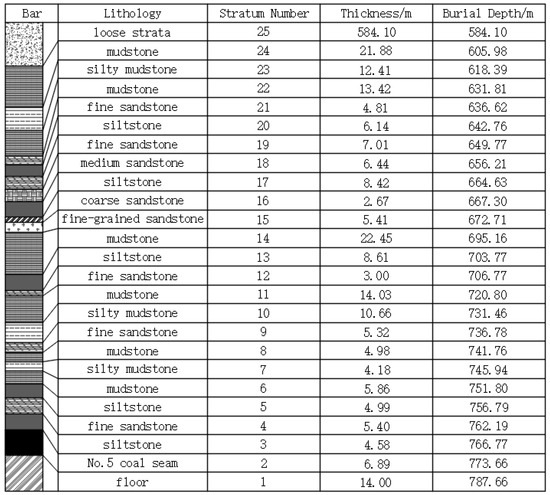 The mining operations are influenced by the overlying water-bearing strata, which include the direct water-bearing strata, represented by the sandstone aquifer above the No. 9 coal seam, and the indirect water-bearing strata, which consist of the pore water-bearing strata in the newly formed loose strata. Under certain conditions related to the water-bearing strata and the structural characteristics of the overburden, mining disturbances may induce a risk of water inrush from the roof, posing a significant threat to the safety of coal seam extraction. The roof strata in the working face are primarily composed of medium-hard sandstone and mudstone. Based on exploration borehole data, the composite stratigraphic column of the working face is shown in Figure 7. The mechanical parameters employed in the numerical simulation model are estimated as follows: the compressive strength is 0.284 times the corresponding laboratory test value [44], while both the elastic modulus and tensile strength are 0.2 times the laboratory test values [45]. The physical and mechanical parameters of the composite strata at the working face are provided in Table 1.