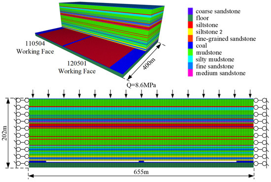 A three-dimensional geological model composed of 35 strata was established by merging a small number of thin strata based on comprehensive geological data, as shown in Figure 9. The parameters were derived from internal laboratory testing reports. The model has a strike length of 400 m; two working faces are arranged in the dip direction, with a total length of 655 m and a grid spacing of 5 m. In the vertical direction, the model is divided according to different strata thicknesses, with unit thicknesses ranging from 3 to 5 m, totaling 202 m. The dimensions of the model are as follows: length (Y) × width (X) × height (Z) = 400 m × 655 m × 202 m. Horizontal constraints were applied to the model to reduce the influence of boundaries on the simulation results, with the bottom boundary fixed in velocity and the upper boundary free.