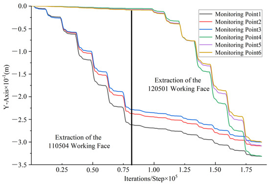 Three displacement monitoring points were established above the center of the 110504 and 120501 working faces, positioned at heights of 50 m, 75 m, and 100 m above the coal seam roof. The monitoring points for the 110504 working face are designated as Points 1, 2, and 3, while those for the 120501 working face are designated as Points 4, 5, and 6. The vertical displacement monitoring results of the roof are illustrated in Figure 10, and the distribution of the plastic zone is presented in Figure 11 and Figure 12.