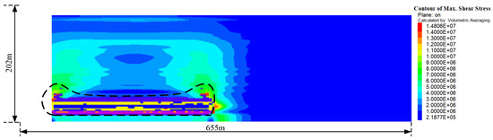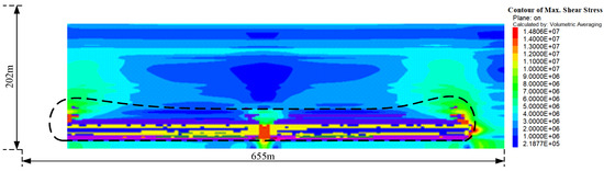 Distribution of maximum shear stress and plastic zone extent in the dip direction of the 110504 working face after extraction completion.