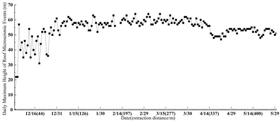 Microseismic monitoring was used on the 120501 working face to assess the development height of the water-conducting fracture zone in the roof following the extraction of the No. 5 coal seam. The development height was determined based on the daily maximum values recorded by the microseismic monitoring system. From the official operation of the monitoring system on 2 December 2023 to the complete destruction of the measurement line on 30 May 2024, the effective monitoring period lasted approximately six months. Microseismic events with a magnitude of 0.2 or higher were considered in the analysis. The comprehensive analysis revealed that the maximum development height of the water-conducting fracture zone in the 120501 working face was 64 m, which aligns well with the predictions derived from this method, thereby validating the effectiveness of the proposed approach. The daily maximum development height of the roof microseismic events during the mining of the 120501 working face is illustrated in Figure 13. This figure specifically presents the maximum height of the hypocenters associated with these roof microseismic events.