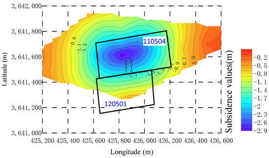 Contour map of ground subsidence during the stabilized subsidence stage of the 110504 working face (5 November 2023).