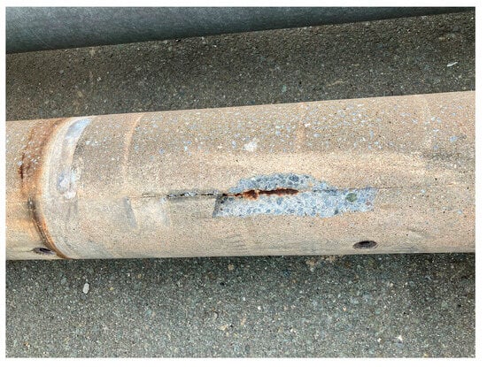 Previous studies have investigated the corrosion of reinforcement bars and cracking of concrete due to salt damage and neutralization [14,15] (shown in Figure 2) and alkali-aggregate reactions [16]. Regarding the deterioration of concrete poles, Hashimoto et al. [14] confirmed that the salt damage to concrete poles may be caused by salt penetration through the vulnerable joints of the formwork when producing the poles. Focusing on salt damage and acid degradation of utility poles, Funamoto et al. [15] conducted appearance surveys of utility poles in seaside areas, hot spring areas, and urban areas and summarized the effects of the surrounding environment. The visual survey results showed that the deterioration progressed rapidly in the seaside location. In addition, hydrogen embrittlement has also been studied in Japan as a degradation event specific to concrete poles. Hydrogen embrittlement is the process by which steel bars lose their elasticity due to hydrogen absorption, resulting in brittle rupture. This phenomenon occurs suddenly without warning signs, such as cracking or rusting. Hydrogen embrittlement occurs under three specific conditions: high-strength materials, stresses in the steel, and hydrogen supplied to the steel. Due to the high strength and prestressing forces applied to Japanese concrete poles, hydrogen embrittlement can occur when the progression of steel corrosion supplies hydrogen. Some cases have been confirmed in which hydrogen embrittlement has occurred. In previous studies, Fujimoto et al. [17] and Kamisho et al. [18] have investigated the remaining life assessment of degradation due to hydrogen embrittlement and the optimization of inspection cycles for concrete poles.