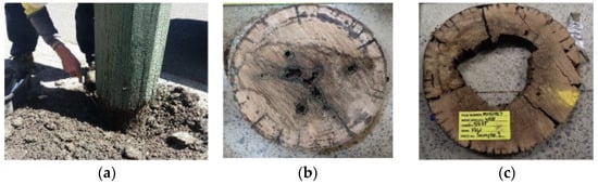 The deterioration factors of wooden utility poles have been identified as decay and damage caused by fungi and termites and damage inflicted by woodpeckers [37,38]. The decay of wooden utility poles generally starts at the point of contact with the ground and spreads throughout the pole shown in Figure 3 [39]. Currently, studies are being conducted on proposing probabilistic deterioration prediction models and applying non-destructive testing (NDT) technologies.